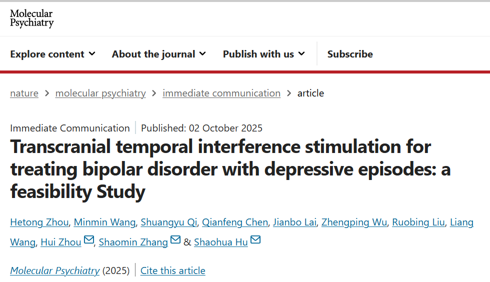 科研速递丨《Nature》子刊:胡少华团队采用经颅时域干涉电刺激(tTIS)技术构建双相障碍快速抗抑郁治疗新模式
